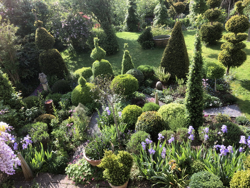 The garden includes a variety of traditional topiary designs, such as spiral and cone shapes, punctuated with vibrant purple flowers to add a splash of colour.