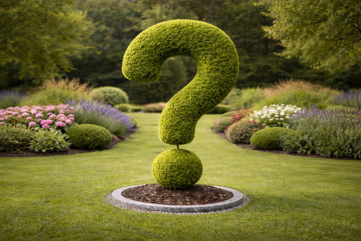 Small topiary balls sit atop perfectly sculpted columns to welcome visitors to the garden, with rounded trees standing proudly around the lawn.